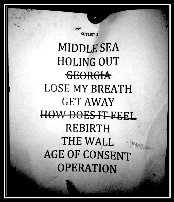 Setlist (incomplete recording) ~ Middle Sea* > Holding Out > Lose My Breath > Get Away > Rebirth* > The Wall* > Age Of Consent* > Operation*