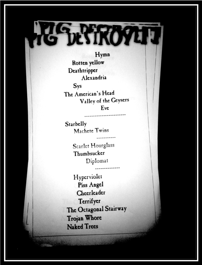 Setlist ~ Hymn > Rotten Yellow > Deathripper > Alexandria > Sys > The American’s Head > Valley Of The Geysers > Eve > Starbelly > Machete Twins > Scarlet Hourglass > Thumbsucker > Diplomat > Hyperviolet > Piss Angel > Cheerleader > Terrifyer > The Octagonal Stairway > Trojan Whore > Naked Trees